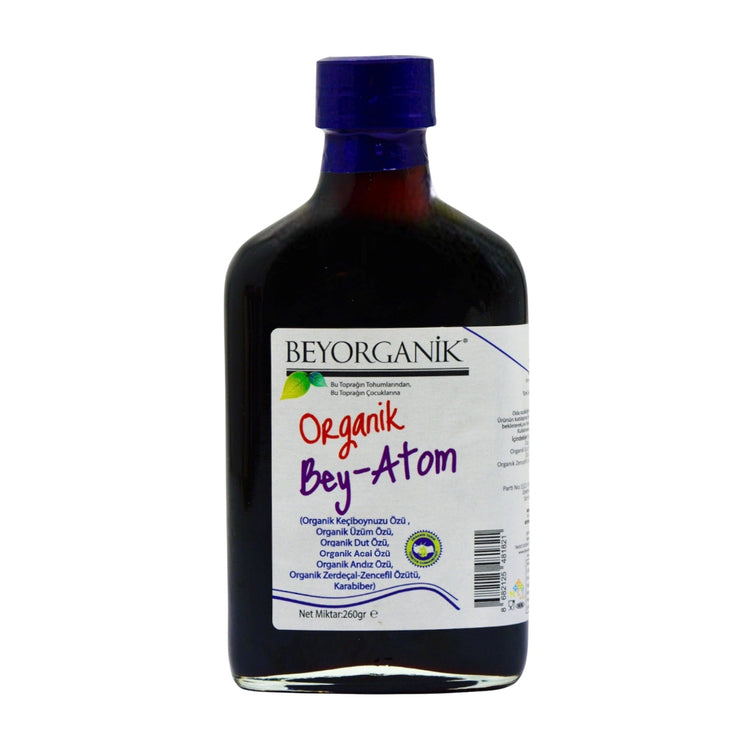 Beyorganik Organic Bey Atom es un jarabe orgánico formulado para apoyar la función inmune. Es apto tanto para niños como para adultos y no contiene edulcorantes artificiales. El producto es bebible y está elaborado con extractos orgánicos certificados. Tiene certificación orgánica USDA/UE.