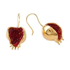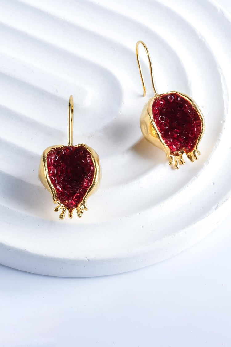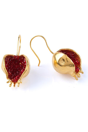 Beyisa Bereket Series Red Garnet Stone Gold Plated Women's Pomegranate Motif Silver Earrings 22K Gold