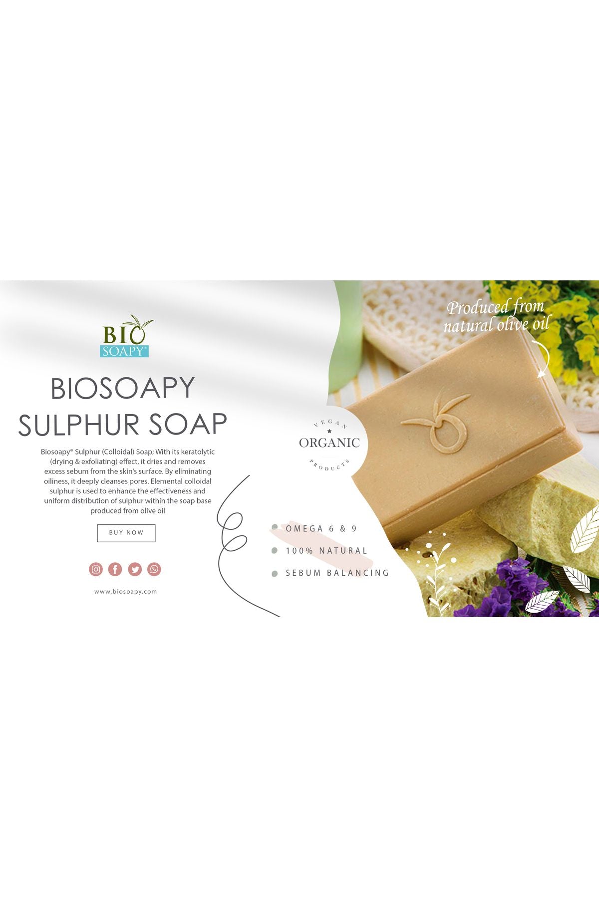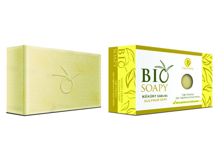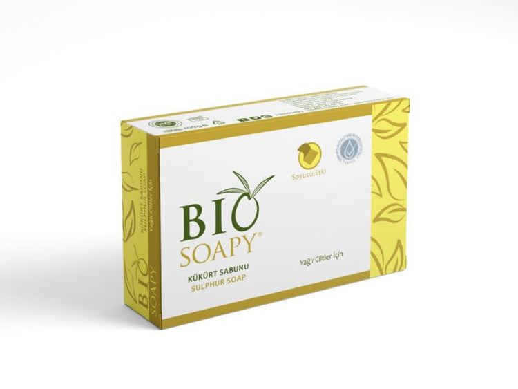 Biosoapy Sulfur Soap 100g – clarifying and antibacterial skincare crafted to support oily and acne-prone skin. With natural colloidal sulfur, this soap dries and exfoliates acne zones while reducing inflammation and neutralizing superficial infections. Its keratolytic and antiseptic properties help deeply cleanse pores and regulate sebum levels.