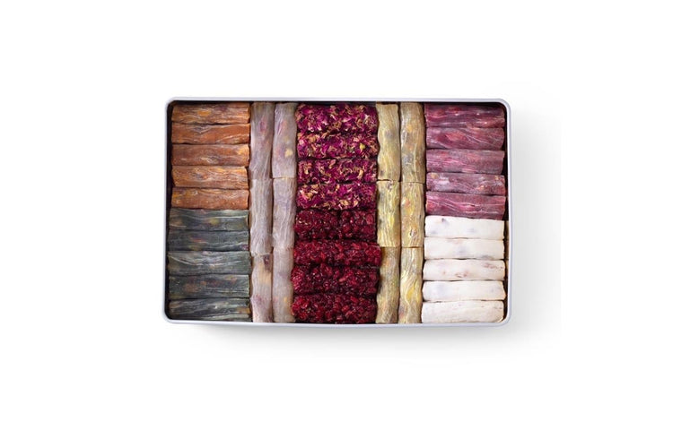 This 700 gr metal box of Mixed Finger Turkish Delight is a premium assortment of handcrafted delights, blending traditional textures with unique flavors and natural coatings. Featuring a rich variety of pomegranate-infused delights, each piece is packed with crunchy pistachios and wrapped in exotic ingredients like rose petals, safflower, and sesame.