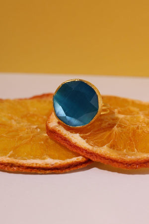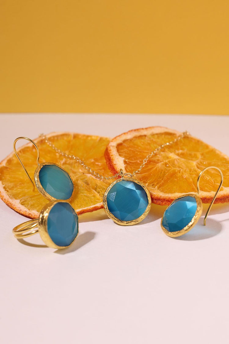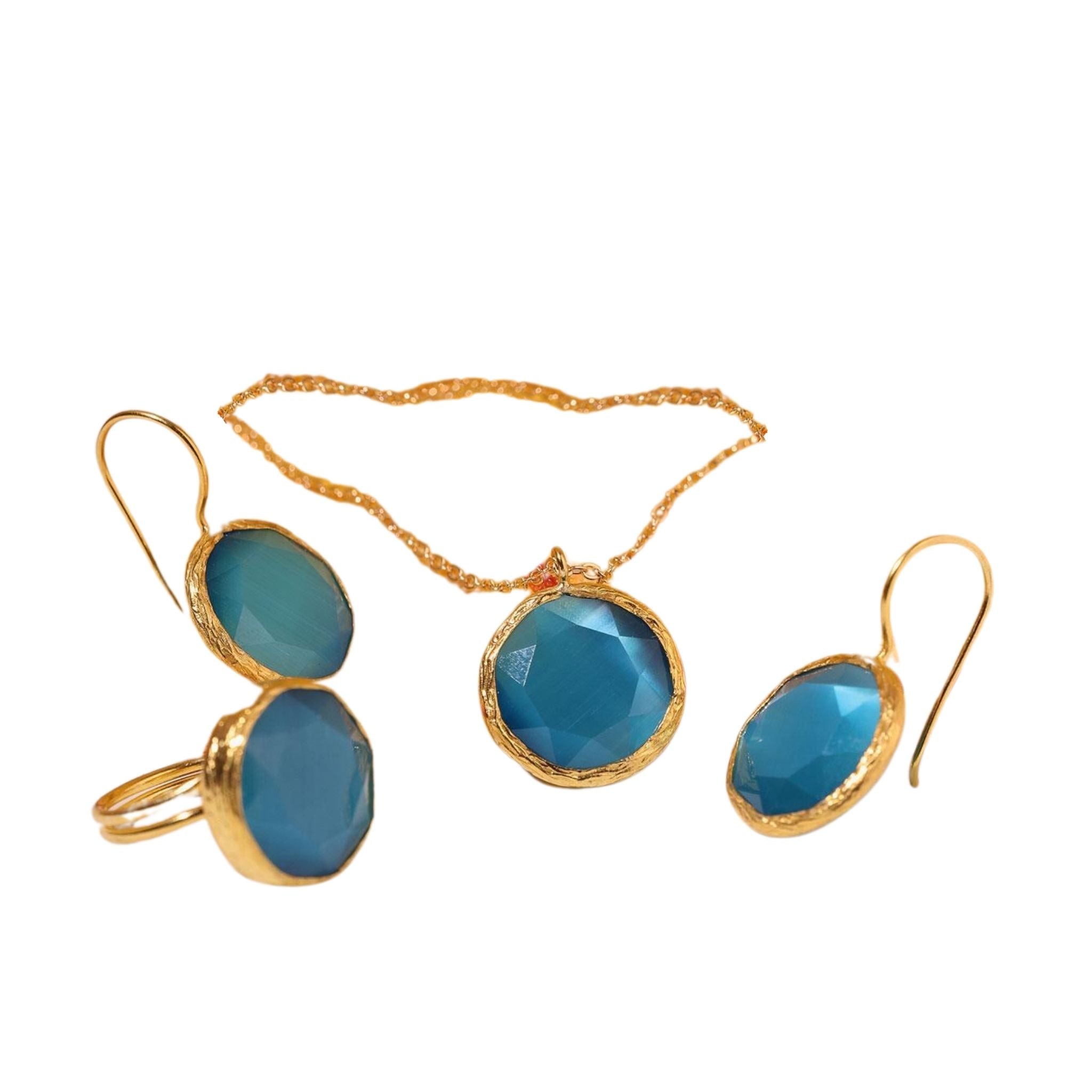 Elevate your elegance with the Sun Stone Round Cut Blue Cat's Eye Triple Set – a polished and radiant jewelry ensemble crafted for modern sophistication. Featuring natural African Sun Cat's Eye stones with a striking blue glow, this handcrafted set includes a round-cut pendant necklace, matching earrings, and an adjustable ring, all plated in 22K gold and paired with a 925 sterling silver chain.