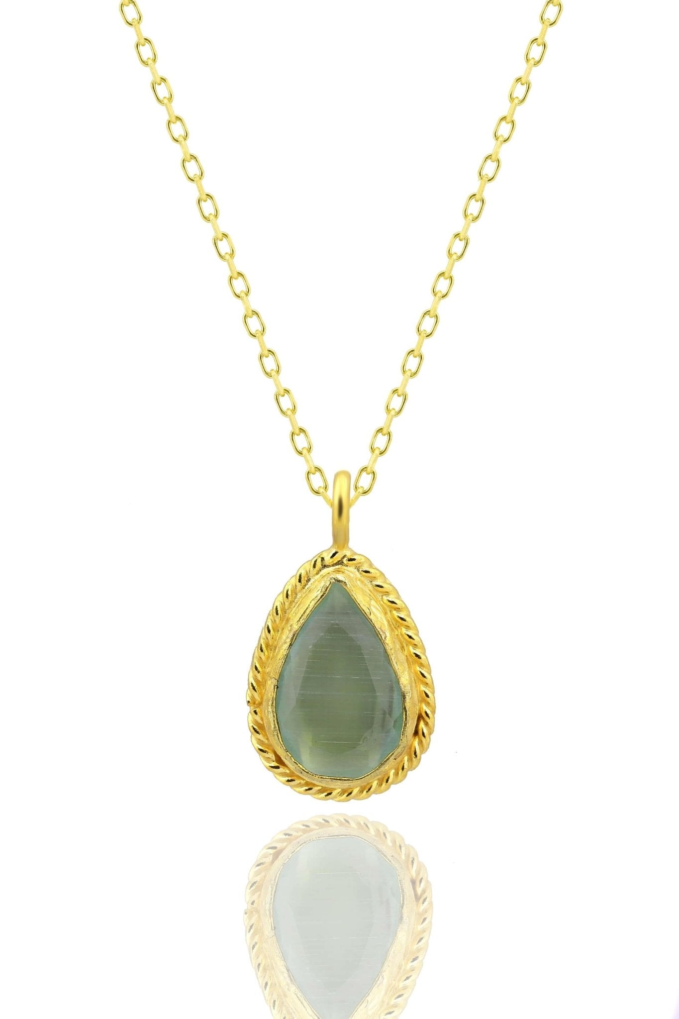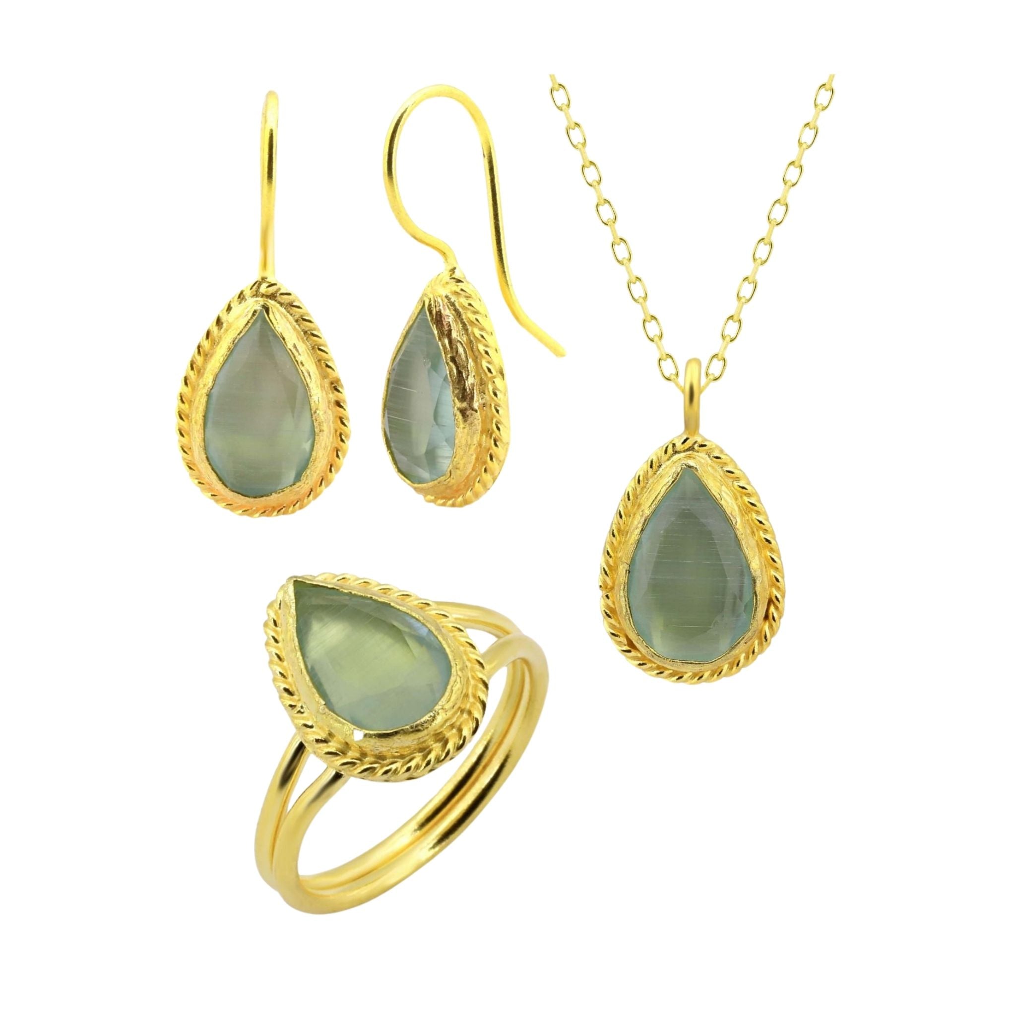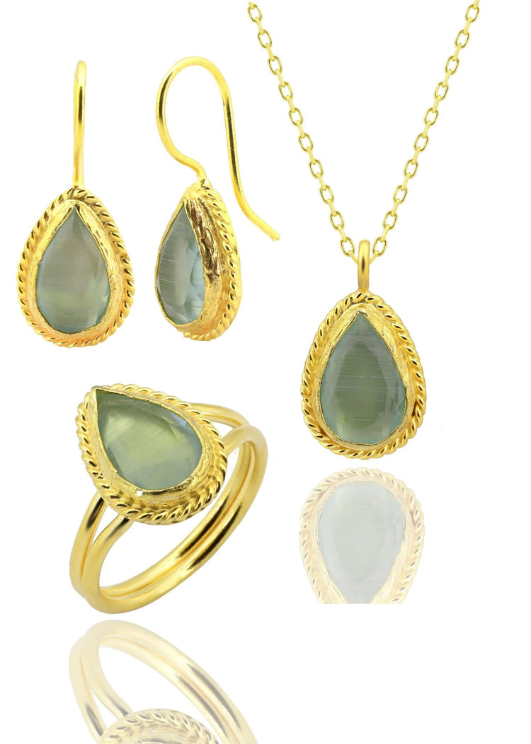 Embrace refined elegance with the Sun Stone Series Winding Drop Cut Blue Color Women's Triple Set, a luxurious ensemble that includes an adjustable ring, necklace, and earrings. Crafted with 22K gold plating and accented by radiant blue Afika sun cat eye stones, this handcrafted set beautifully blends traditional craftsmanship with contemporary allure. The necklace features a 925 sterling silver chain, providing a touch of durability and classic style.